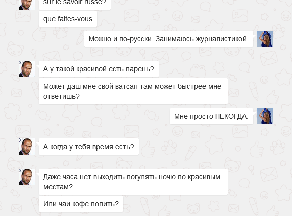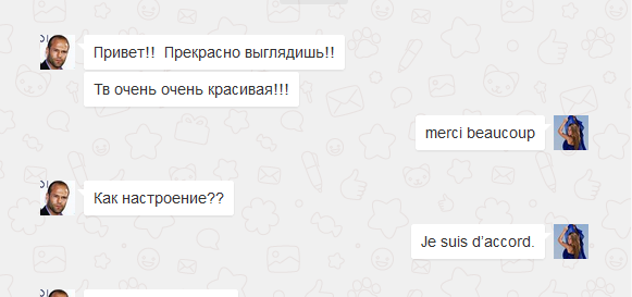 Он ведь простого французского языка не знает! А я ведь могу сказать — мол приезжай- и знаете- ведь не поверите- хотят приехать- но я же не дура! Конечно я говорю- мол не стоит! Вот что пишут мне (конечно я выбрала без очень больших чувств- там как правило половые органы присылают:-)