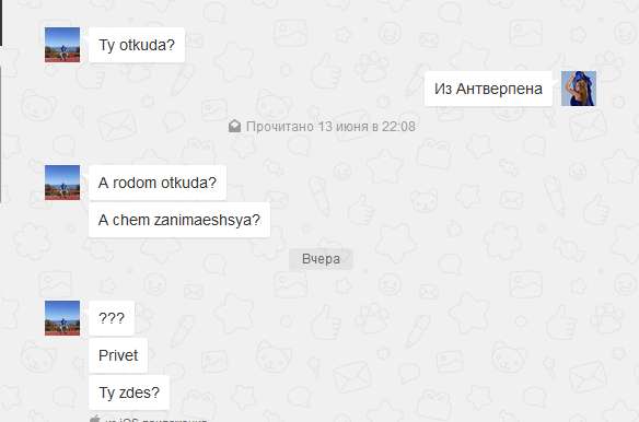 Я просто угораю от писем, которые мне присылают. В ВК- там другое- там чисто то по приколу, но в Одноклассниках. там всё как бы «серьёзно»- мне конечно смешно, но мне интересно на что рассчитывают мужчины в соц.сетях? Например я живу в Москве. бываю в Антверпене- но пишут отовсюду! Ну как парень или мужчина из Ростова может поехать в Антверпен?