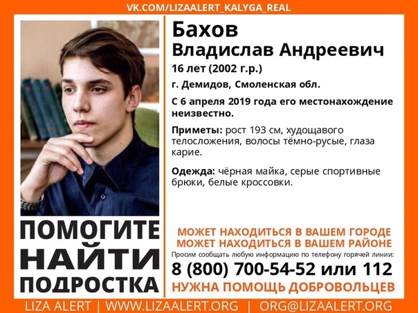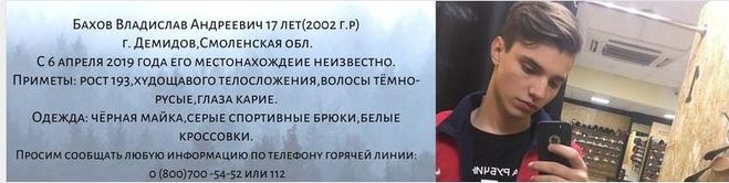 Владислав Бахов 14.09.2002 гр, без вести пропал 06.04.2019 в Смоленской области, в лесополосе около города Демидов. В Демидове живет бабушка и отец Влада. Сам он с матерью и отчимом проживал в Смоленске.