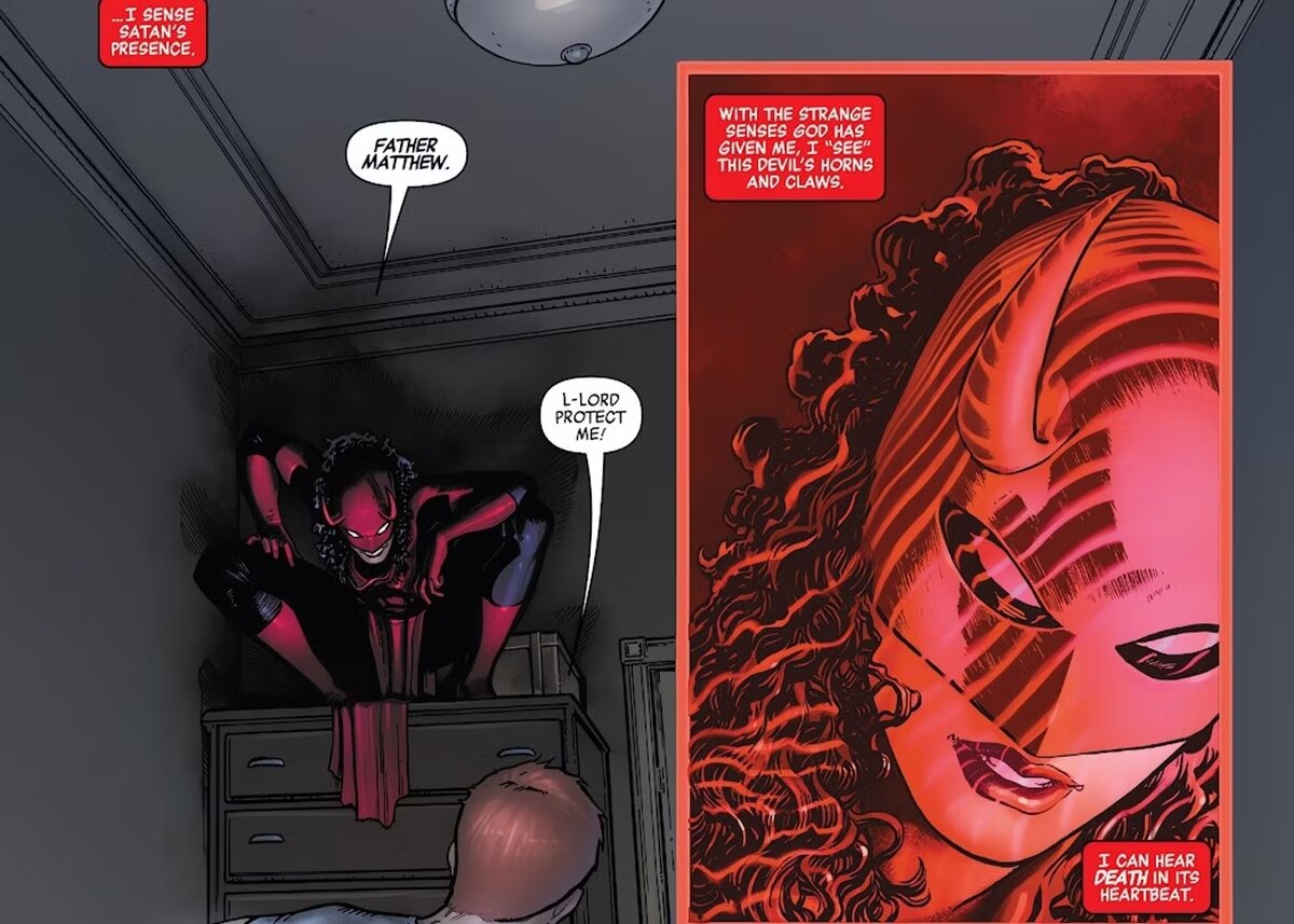 «Я чувствую присутствие Сатаны», — объясняет читателям внутренний голос Мэтта. «С помощью странных чувств, которыми наделил меня Бог, я вижу рога и когти этого дьявола. Я слышу смерть в биении его сердца». Сразу становится ясно, что способность — нечто большее, чем просто воспоминание об Электре и осознание того, что что-то не так.
