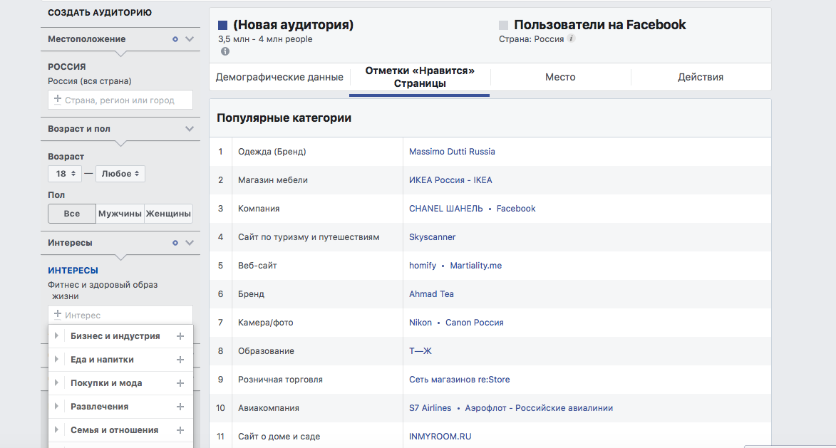 Но это слишком широкая аудитория. Вы можете узнать, на какие страницы подписаны люди, которым нравится тема фитнеса, и потом запускать рекламу на них, выставляя в интересах эти страницы.