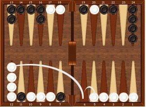 Примечание: При первом броске белых 5-5, и последующем броске чёрными 4-4, последние снимают одну шашку с головы играя одну четвёрку, так как пройти дальше мешает созданная помеха.