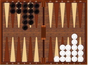 1.1. Играют двое. Игра идет на специальной доске, разделенной на две половины (левую и правую). Количество шашек на доске по 15 у каждого игрока, которые расставляются на своей части доски вдоль правой стороны. Наборы шашек у игроков разного, обычно чёрного и белого цвета. Количество зар — 2. Игроки по очереди выбрасывают зары (игральные кости).