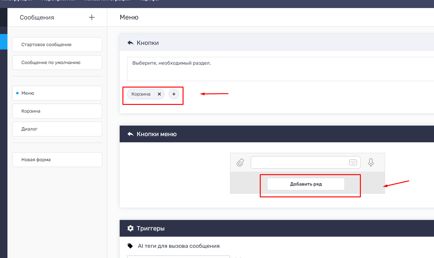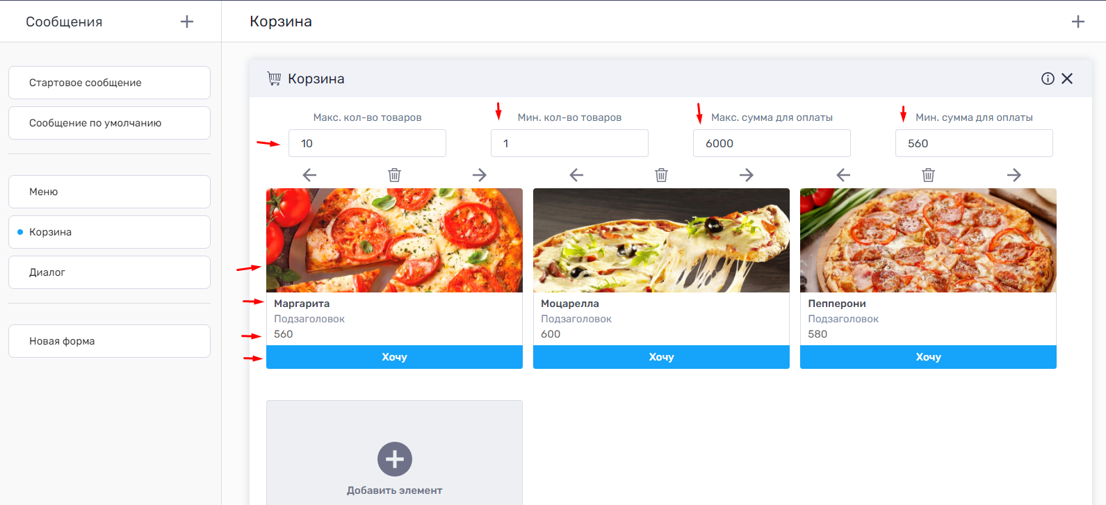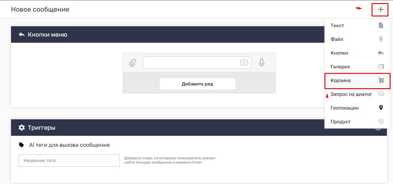 Шаг 1: Для этого заходим в конструктор бота telegram. Нажимаем плюс, выбираем элемент «Корзина». Его можно добавить в любое сообщение, кроме стартового и сообщения по умолчанию.