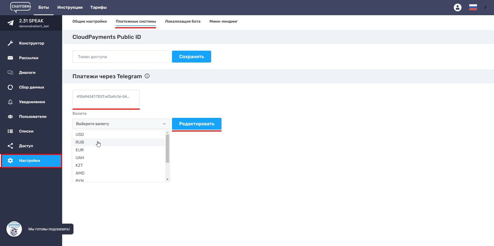Шаг 8: Нажимаем Редактировать. Прием платежей настроен. Теперь в боте при нажатии на кнопку «Оплатить» у пользователя появится форма оплаты.