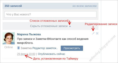 Заметку не обязательно публиковать сразу после написания. Можно отложить время публикации с помощью т.н. Таймера. А за это время её дописывать и редактировать. При этом отложенная запись будет находиться вверху Стены в списке «Показать отложенные записи».
