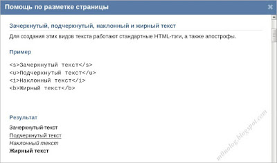 В режиме wiki-разметки текста Заметки можно использовать такие html-теги, как выделение текста жирным, курсивом, подчёркивание, зачёркивание, размещение текста по центру.