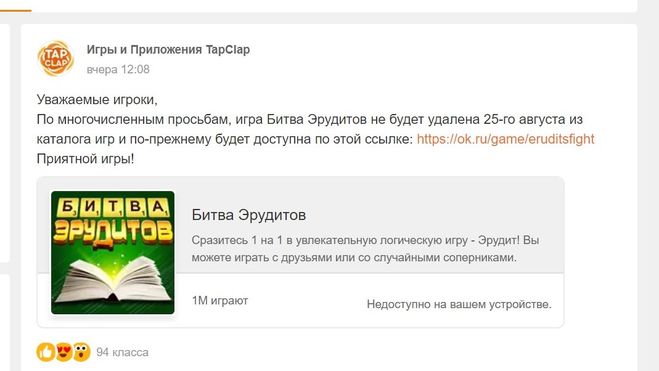Действительно, 25 июля разработчик самых популярных игр и приложений для соцсетей и мобильных платформ TapClap объявил о том, что с 25 августа ряд игр будут удалены из каталога и недоступны. Среди них приложения «Драгоценные камни», «Морской бой», «Шаробум», «Собери букет», «Легенды морей», «Звездопад», «Правда о тебе: Узнай сейчас». Вошла в этот список и игра «Битва эрудитов».