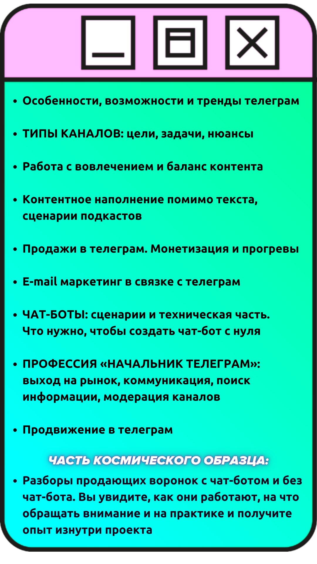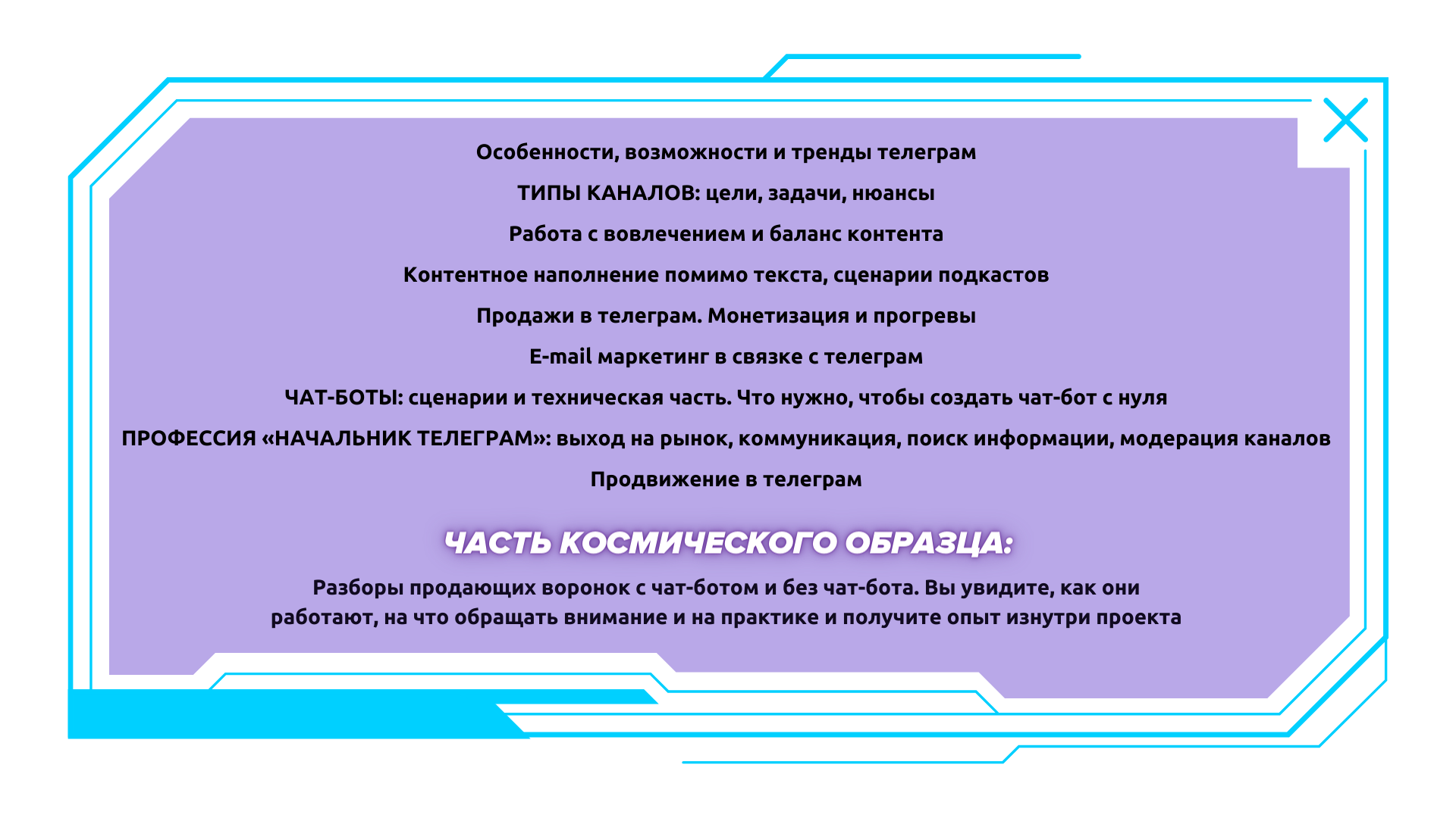 - Разбор алгоритмов, которые позволят быстро понять принцип работы телеграм: актуальные ниши, рабочие креативы, фишки, лайфхаки, успешные связки
