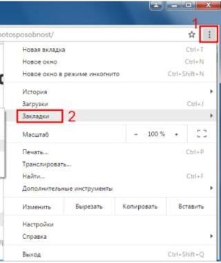 В правом верхнем углу браузера нажмите на три вертикальные точки и затем нажмите на строку «Закладки»: