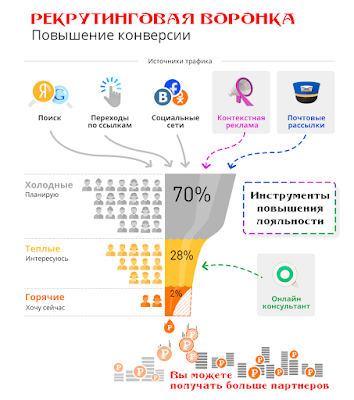 Такую технологию рекрутинга еще называют рекрутинговой воронкой, которая может иметь различные формы и проявления, но цель имеет одну.