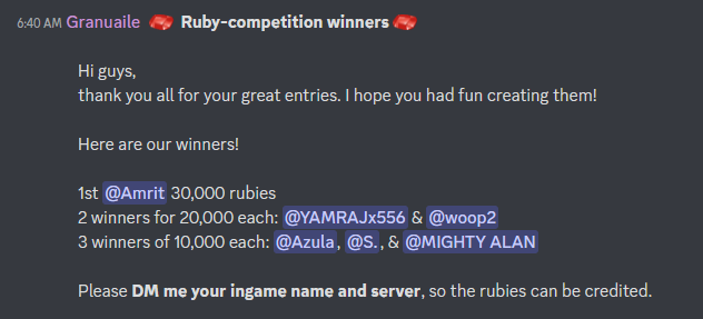 Объявление победителей выглядит примерно вот так. Синее — это ники пользователей, им обычно дополнительно приходит уведомления.
