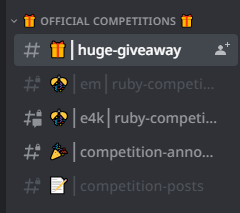 5) Теперь заходим в канал с розыгрышами (Official competitons), ищем подканал где проходит розыгрыш и жмем кнопку участвовать. Все розыгрыши проходят там. В этом канале и подканалах всегда. На момент написания этой инструкции розыгрыш проходил в #huge-giveaway. Спустя время в этом же канале, но в другом подканале будет.