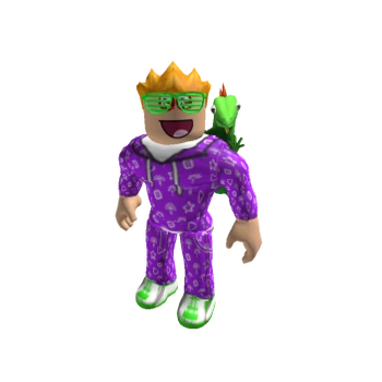 Фиолетового-волосый человек с лицом «ROBLOX Madness Face» в фиолетовой футболке из мерча и такими же фиолетовыми ботинками, с зелёными очками и с игуаной по имени «Спарки».