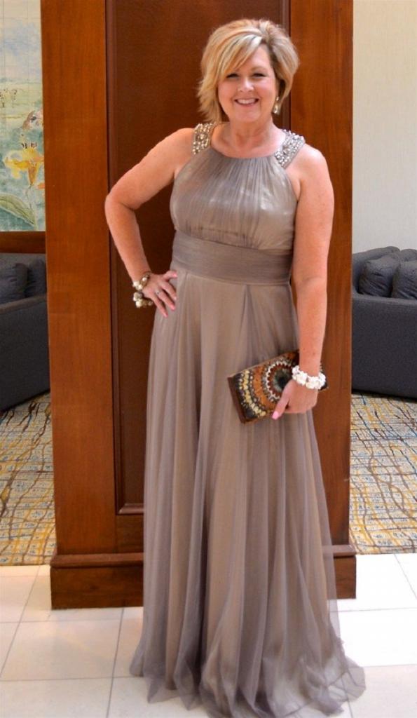 - Платье годе. Это самый отличный вариант для дам за 50. Образец плавно расширяется от груди или талии.