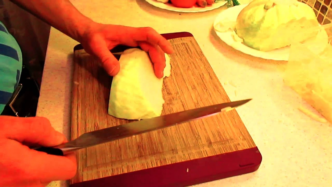 При резке ножом выбирают верхнюю часть кочана, где листья более плотные. Одно из важнейших правил — это держать нож всей рукой, а не кончиками пальцев. Но при этом важно, чтобы первые фаланги пальцев были согнуты. В этом случае руки будут защищены от порезов.