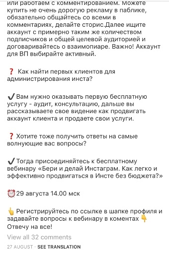 В продающем посте лучше использовать личное фото или фото продукта, шаблон менее предпочтителен. Есть Call to Action — регистрируйтесь по ссылке в шапке профиля; есть подробное описание услуги.