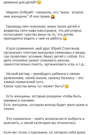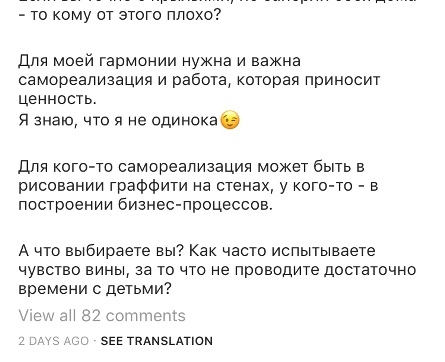 В вовлекающем — холиварная или просто интересная тема (это важно!) и вопрос, который так и манит подумать и что-то ответить: «Как часто вы испытываете чувство вины за то, что не проводите достаточно времени с детьми?» (мамская боль).