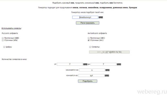 Имеет расширенные настройки генерации. Перед созданием логина на этом сервисе можно указать, какие символьные наборы необходимо использовать (строчные и прописные буквы, спецсимволы и цифры), а также буквы или слоги, на которые адрес должен начинаться и которыми заканчиваться.