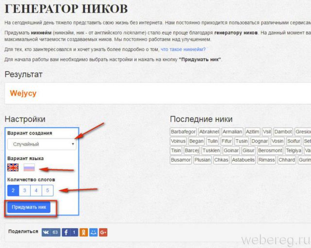 Предлагает три варианта создания: «Случайный», «Фэнтази», «Фруктово-овощной». Также в нём можно установить язык (русский или английский), а также количество слогов.