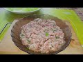 1. Промойте мякоть свинины, нарежьте средними кусочками и два раза перекрутите в мясорубке.