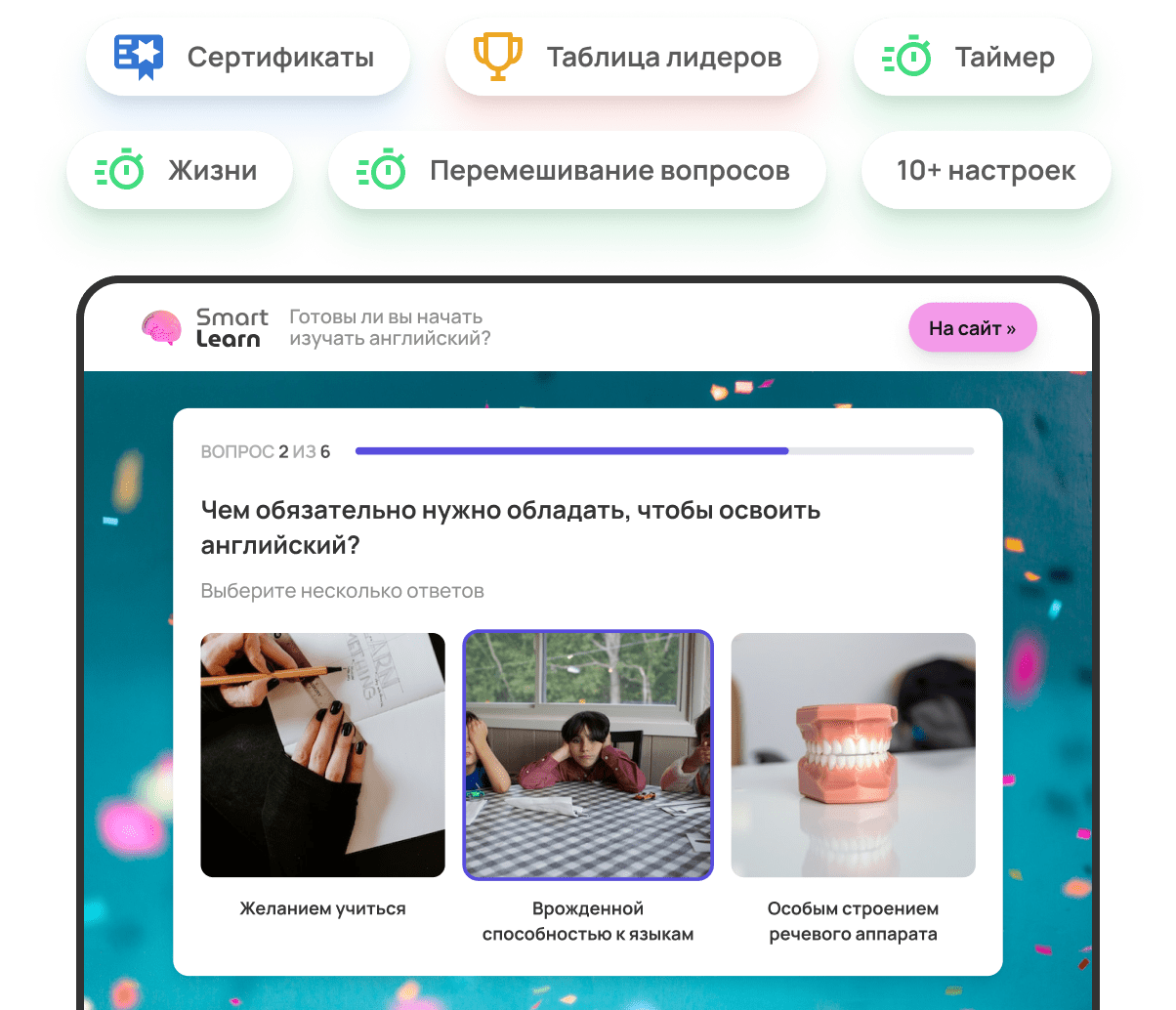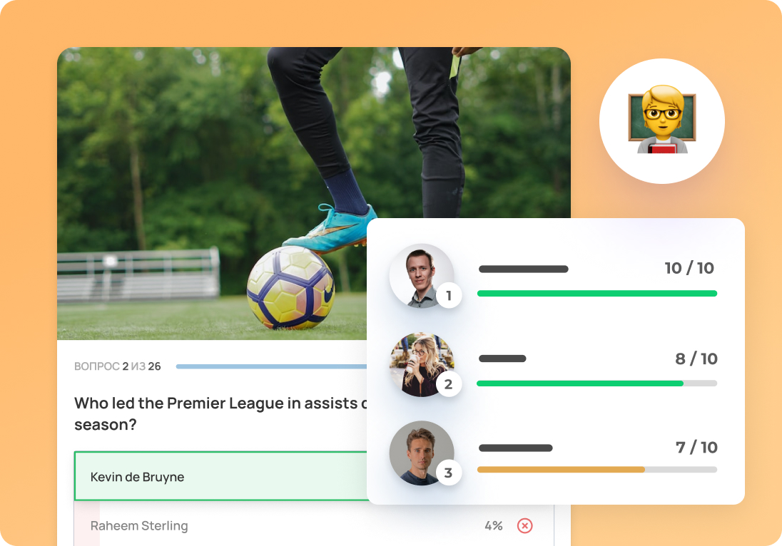 Проводите полноценные тестирования на уровень знаний, а также устраивайте веселые коллективные викторины.