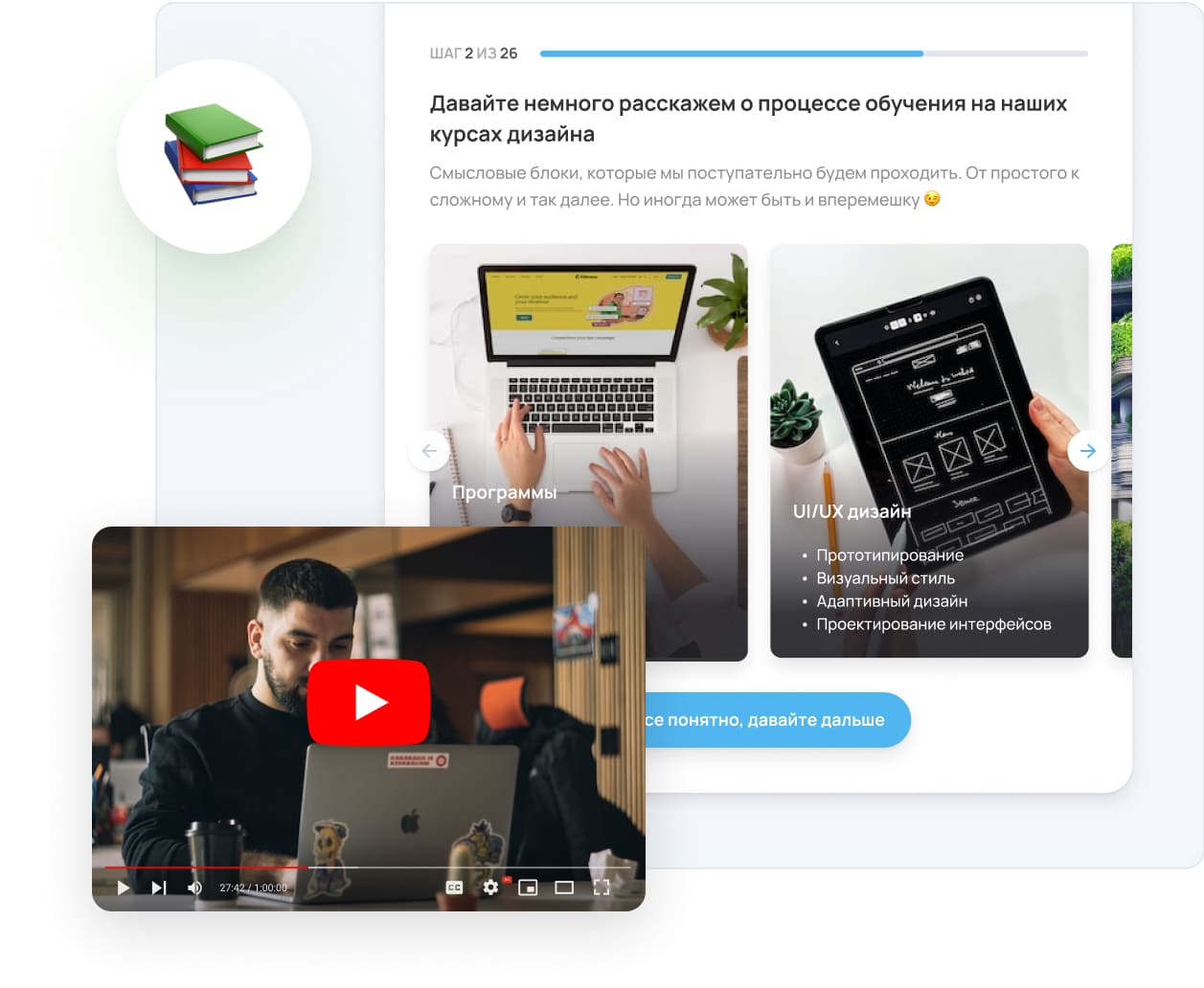 Применяйте разные типы вопросов, чтобы не отпускать внимание пользователя. Не забудьте про объяснение ответа, которое вы покажете пользователю после ответа.