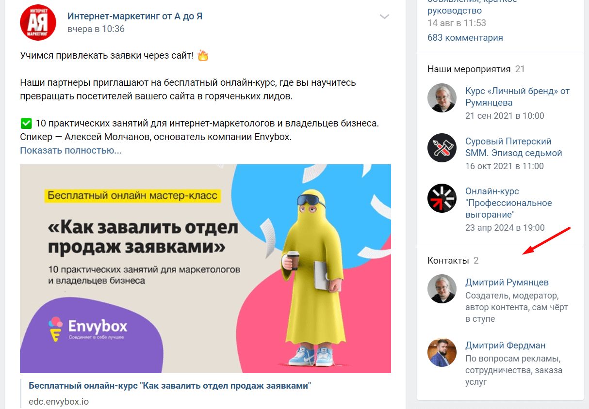 Платформу для размещения нашли. Теперь перейдите в раздел Контакты и напишите администратору, который отвечает за рекламу. Согласуйте с ним объявление, дату публикации и другие детали. Не забудьте запросить скриншоты актуальной статистики.
