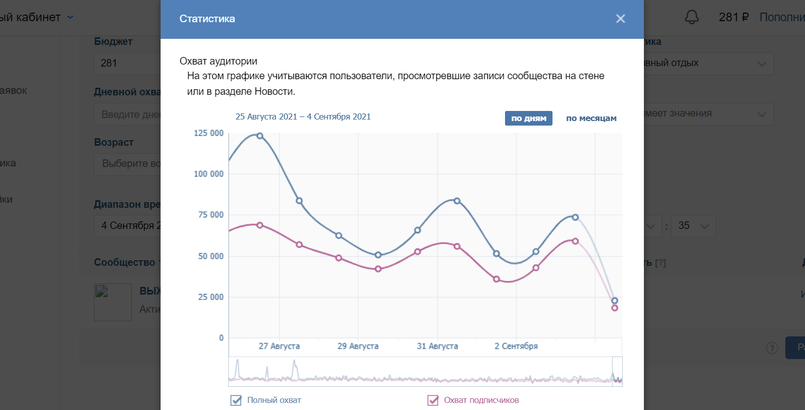 Вы как автор рекламной записи, после ее публикации, можете следить за ее статистикой. Естественно это только для рекламных записей со статусом «Активная» и «Выполненная». Есть специальный график, на котором отображены переходы по ссылке из рекламной записи и потраченные на рекламу средства.
