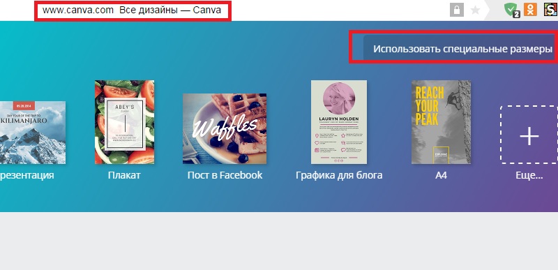 Еще одним интересным местом, где можно создать красивую иллюстрацию является сайт https://www.canva.com/ Здесь представлена масса интересных и креативных картинок для дизайна. Для того, чтобы приступить к работе на ресурсе, пройдите регистрацию или авторизуйтесь через Фейсбук. Далее, вы можете перейти в личный кабинет. Чтобы выбрать баннер именно для Ютуба, справа коснитесь кнопки «Использовать спец. размеры». Вбейте актуальные для шапки параметры и приступайте к поиску нужной картинки.