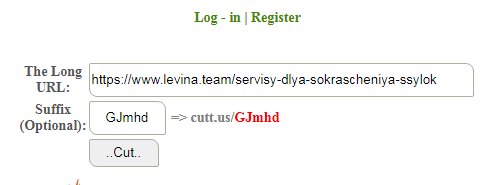 Первый предназначен для стандартного сокращения URL. Вставьте в пустое поле длинную ссылку, впишите уникальное название адреса в поле «Suffix» и кликните по кнопке «Cut» .