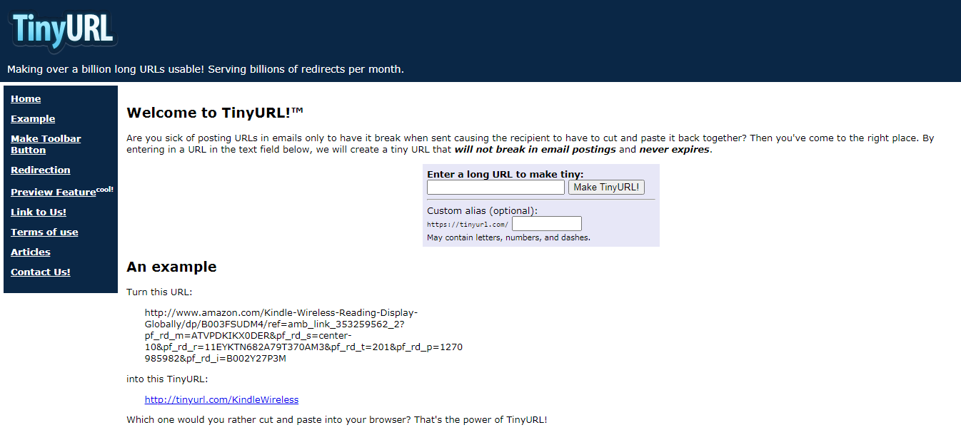 Tiny URL.com – это один из самых старых и популярных сайтов для сокращения URL. Сервис был создан в 2002 году. За время своего существования он успел поработать с Twitter, пока социальная сеть не перешла на bit.ly, а затем и вовсе на свою собственную систему t.co.