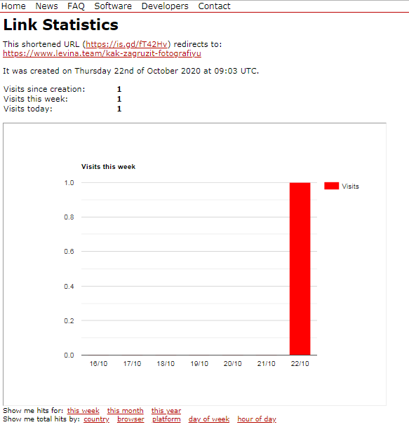 При помощи статистики пользователь сможет отслеживать количество переходов по URL и сортировать их по таким критериям, как дата, страна, браузер и др. Чтобы просмотреть статистику, нужно кликнуть на «I want to see statistics for this URL» после создания укороченного адреса.