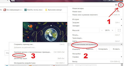 В правом верхнем углу браузера жмем значок меню настроек (на скриншоте показано), наводим курсор на дополнительные инструменты и открываем пункт — расширения