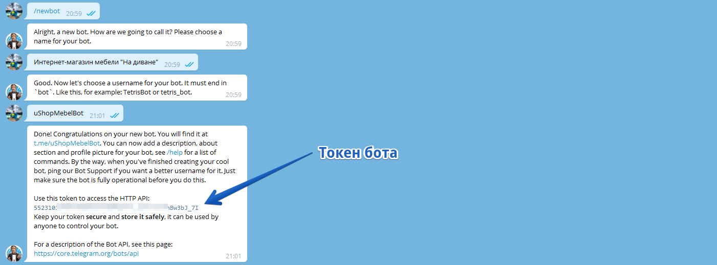 Переходим в BotFather и создаем нового бота при помощи команды «/newbot», забираем токен и переходим дальше: