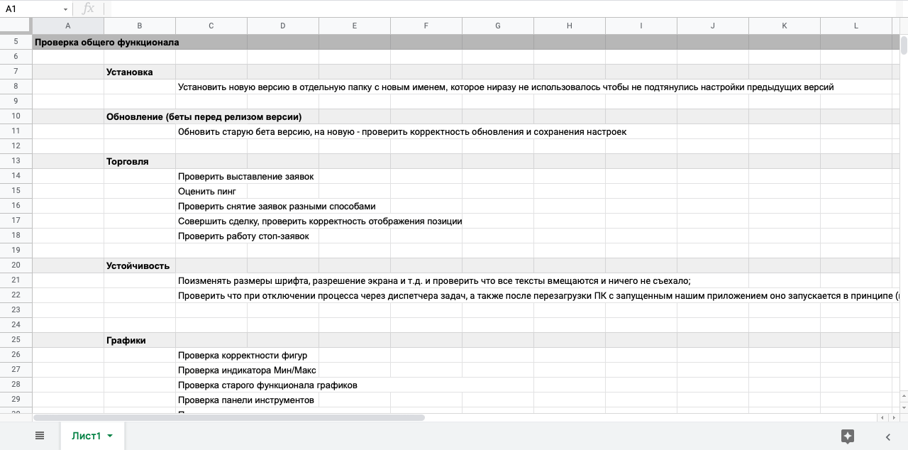 Разработчики передают тестировщикам дистрибутив альфы и присылают чек-лист в формате Google-таблиц в закрытый чат.