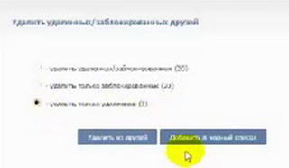 И появляется такое окошечко: выбираем,что нам нужно, какие функции. Ну,например, удалить удаленных или заблокированных друзей.Подтверждаем.