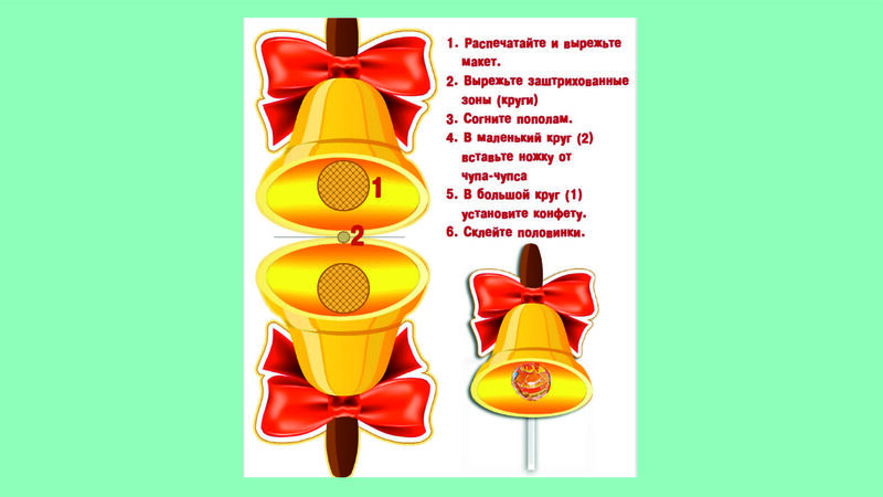 Конечно, не просто сладости, а красиво оформленные. Например, можно сделать «чупа-чупс»-колокольчик. Печатаем макет, вырезаем — и готово!