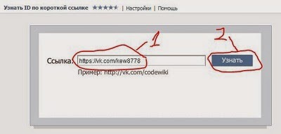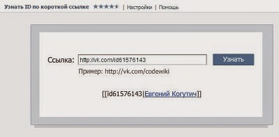 - 1. Через специальное приложение в Контакте. Вот ссылка на него: http://vk.com/linkapp. Введя в него нужную нам ссылку человека, например http://vk.com/kew8778 и нажав «узнать»:
