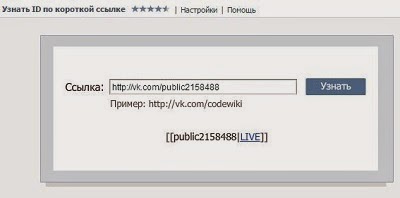 Для того чтобы узнать ID таких сообществ ВК (группы или паблика) можно также воспользоваться приложением Linkapp, в которое вставляем ссылку на сообщество и смотрим её айди. Для паблика https://vk.com/live получаем айди 2158488: