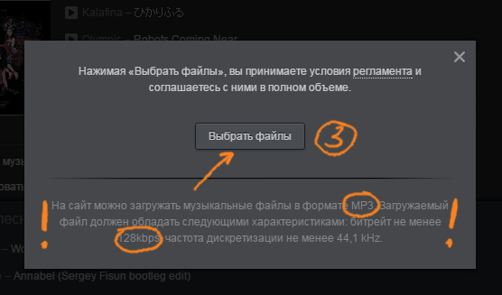 Важно! Можно загружать треки только в формате MP3 и с битрейтом не менее 128 kbps.