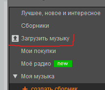 Для этого зайдите в раздел «Музыка» и на панели управления слева найдите кнопку «Загрузить музыку».