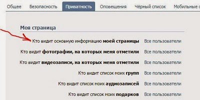 В строке «Приватность» существует очень много пунктов, но в них вы тоже можно разобраться. Нажмите на любую строчку, для примера возьмите первую: «Мои настройки» — «Приватность» — «Кто видит основную информацию моей страницы». Справа вы увидите синюю подсветку (по умолчанию светится пункт «Все пользователи»), при нажатии на которую высвечивается список тех, кто может видеть стену: «Друзья», «Друзья друзей», «Только вы», «Все пользователи», «Некоторые друзья» и «Все, кроме…» Надо выбрать нужное и нажать правой кнопкой мышки на этот пункт.