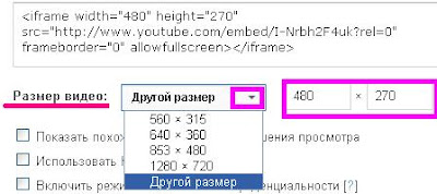 - Чтобы УМЕНЬШИТЬ размеры отображаемого в Blogger видеоролика — в первую пустую рамочку справа впишите желаемый размер ширины экрана. Причем, второй параметр (высота) подставится автоматически для сохранения пропорций и нормального просмотра видео.