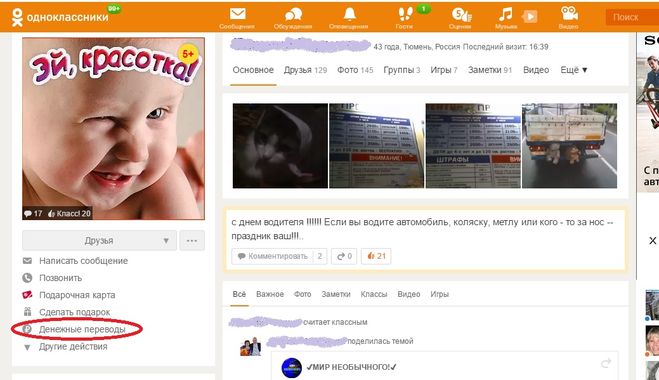 Чтобы осуществить перевод потребуется авторизоваться на Одноклассниках и зайти на свою личную страничку, либо на страницу того человека, которому Вы хотите отправить перевод. Там, в меню под вашей аватаркой или под аватаркой друга соответственно, Вы увидите ссылку на этот финансовый сервис «Одноклассников»: