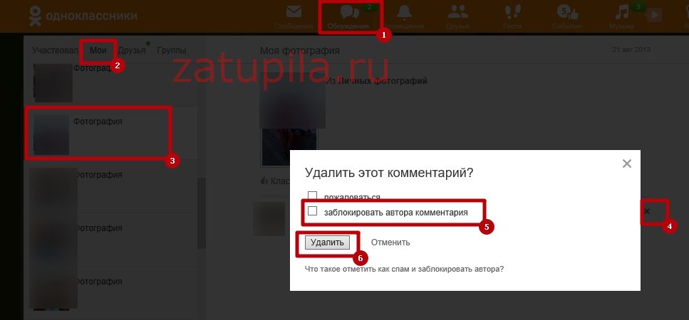 Часто бывает так, что пользователь пишет бессмысленные или оскорбительные комментарии к Вашим публикациям. В таком случае необходимо заблокировать пользователя по комментариям. Сделать это просто. Заходите в раздел «Обсуждения», выбираете нужный комментарий и нажав на крестик рядом с датой публикации комментария, увидите пункт «Заблокировать автора комментария».