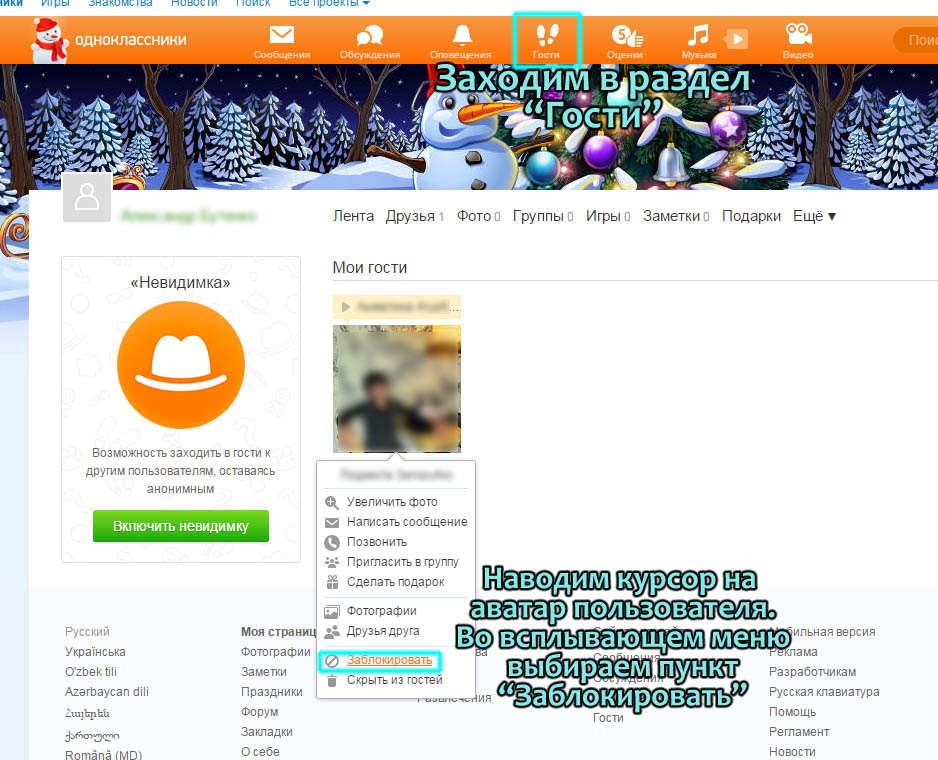 - Если был в гостях на Вашей страничке. Для бана следует в меню Гости 1 найти неугодного, навести указатель мышки на фотку и в выпадающем меню выбрать Заблокировать 2.