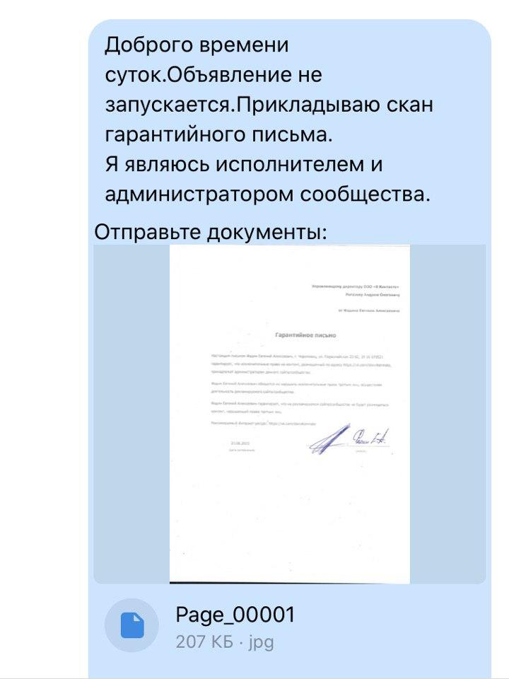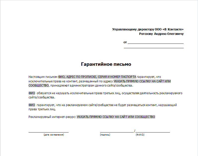 Скан паспорта и гарантийного письма необходимо отправить в техподдержку модераторам по ссылке https://vk.com/support?act=new_ads