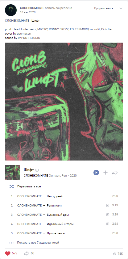 Продвижение записи с релизом со стены сообщества, без создания дубля желаемых результатов в плане подписок не принесло, но общее прослушивание EP на всех площадках составило 11000. Заслуга в этом не только у таргетированной рекламы. Сам исполнитель активно закупал посевы в сообществах. Но они тоже не принесли большого количества подписчиков.