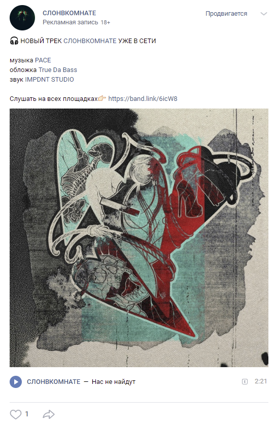 Среди моих близких друзей есть человек, глубоко увлечённый музыкой. Мы давно планировали попробовать запустить рекламу в Вк для продвижения его сообщества и аудиозаписей. Сам паблик тут, кстати — СЛОНВКОМНАТЕ.